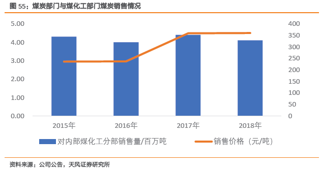 公司煤化工业务所用煤炭均取自自身煤炭部门,煤炭部门每年销售约4 百万吨煤炭于内部煤化工分部,销售量一直较为稳定,但销售单价呈一定幅度每年攀升。在公司自产煤成本管理优良,在行业内占有优势的情况下,销售价格上升实质上是将利润归属到了煤炭部门,不影响公司本身总体经营情况。