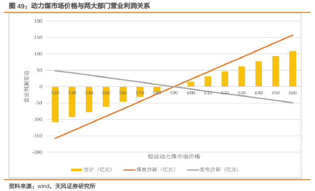 综合看来,如果吨煤价格上涨10 元(这里以秦皇岛动力煤Q5500 市场价格为基准),公司发电分部营业利润减少0.82(亿吨)*10*70%*1.03 +0.11(亿吨)*10=7.01 亿