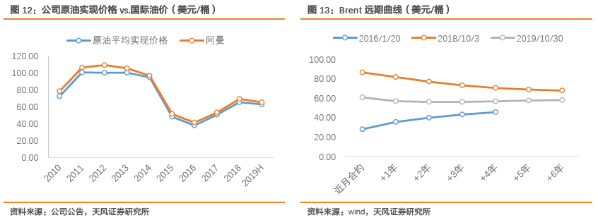 公司原油实现价格:跟随国际油价,比阿曼价格略低3 美金/桶左右。不应过度关注油价短期波动,从未来现金流折现的角度,更应关注原油远期曲线的平移变化,而远月合约的价格波动远小于近月合约。