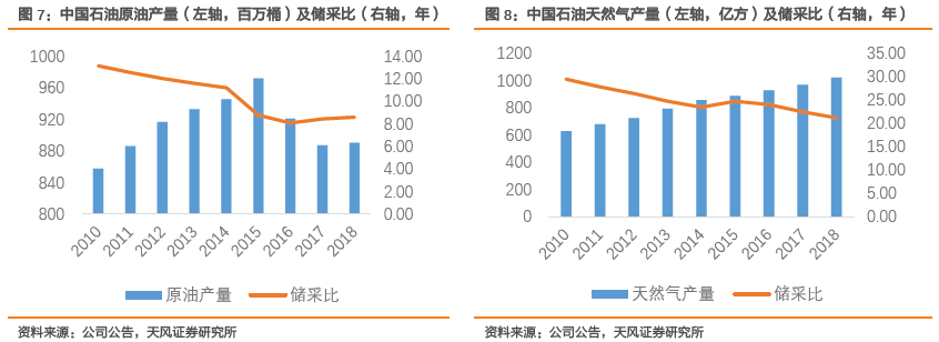 中国石油储采比年限2010~2018 年总体下降。中国石油2018 年底总储量204 亿桶油当量,其中原油76 亿桶,天然气21662 亿方。2018 年原油产量8.9 亿桶,天然气产量1022 亿方(6 亿桶油当量),油气比例略大于3:2。储采比年限从18 年下降到14 年,石油、天然气分别为9 年和21 年。
