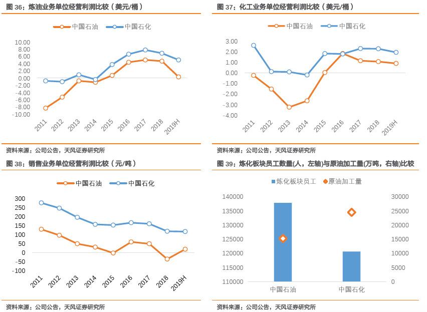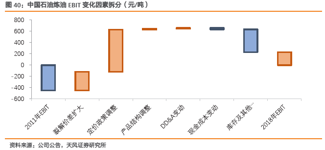 其中尤其以炼油利润好转明显,化工盈利亦有修复。炼油单位EBIT 从2011 年的-8.3 美金/桶,到2018 年为+4.7 美金/桶,主要受益两方面因素:1)成品油定价机制改革,以及成品油优质优价政策;2)裂解价差扩大,反映全球炼油行业整体性盈利修复。