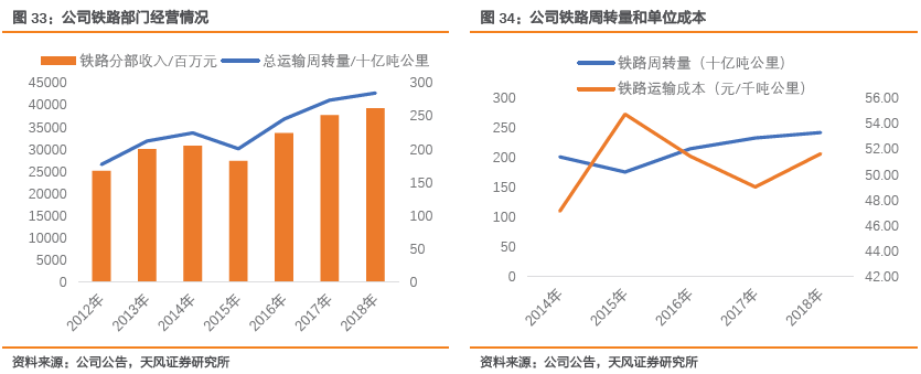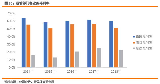 2018 年,公司的运输业务毛利率高达43%,远高于煤炭业务的29.2%和电力业务的22.6%,为公司贡献14%收入和26%的利润。运输业务由铁路、港口和航运三部分构成,其中以铁路业务最为主要。