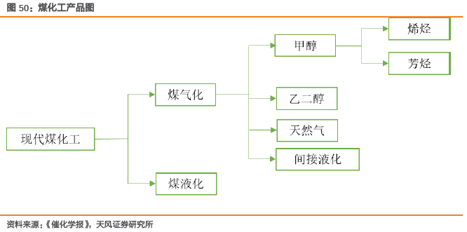 煤化工分为传统煤化工和现代煤化工,传统煤化工是指煤炭焦化、煤制化肥、煤制甲醇及下游产品、煤基聚氯乙烯等,主要特点是生产规模较小、主要产品单一、环保设施简单。