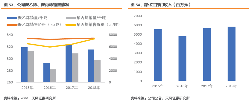 从收入端来看,2015 年来,公司聚乙烯、聚丙烯销量和销售价格除因2016 年原油价格下跌而有所下滑外,其余时间均较为稳定。2016 年来聚丙烯单价依然呈上升趋势。而煤化工业务的收入同样也除了2016 年有所下降,其余时间均于55 亿元以上呈稳定状态。