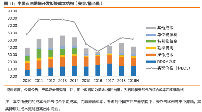 公司强调“效益增储、效益建产”,新上表储量有望拉动公司单位DDA 成本和整体桶油成本下降。2019 年上半年,公司上游板块折旧摊销折耗771 亿,同比-89 亿;油气综合成本约41 美金/桶当量,同比下降约7 美金/桶当量。