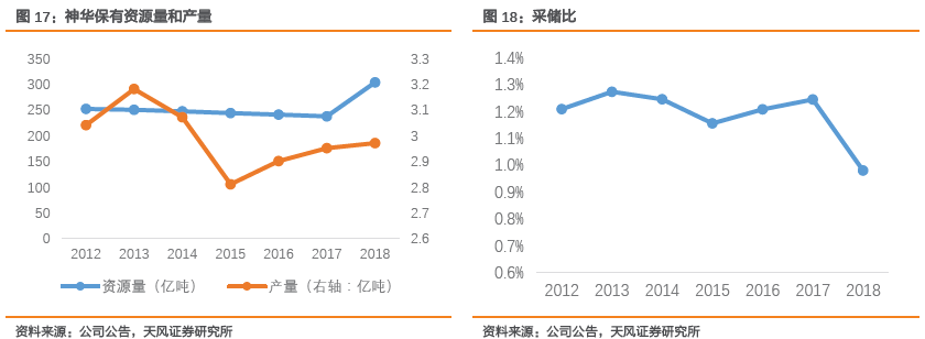 保有资源量方面,公司努力积极推进煤矿采矿用地申请及资源获取工作。2018 年公司煤矿开发和开采相关的资本性支出约41.41 亿元,主要是新街台格庙矿区前期开发支出,神东、准格尔、宝日希勒等矿区煤炭开采、支付采矿权价款以及购置固定资产等相关支出。2018年保有资源量较17 年末增加66 亿吨,增长27.8%。主要是新街矿区台格庙北勘查区完成矿产资源储量评审,保有资源量增加。预计公司保有资源量会随着资源勘探开发持续增长。
