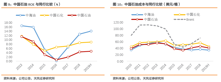 2014 年油价见顶之后的近6 年里,中国石油的上游成本控制在同行中相对较差。中海油凭借上游成本持续下降,ROE 在2018~2019 年已经接近2013-2014 年油价高位时期。中国石化则因其下游炼化体量最大,而炼化在2016 年之后进入景气周期,ROE 也得到较好恢复。中国石油,作为利润以上游业务为主的公司,成本控制不尽人意,油气综合成本从与中海油基本相当变为明显高出中海油。