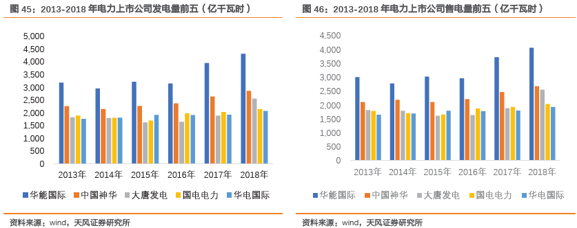 公司发售电量均居全国电力上市公司第二,发电机组平均利用小时为全国第一2018 年,公司总发电量 285.32 十亿千瓦时,总售电量 267.59 十亿千瓦时,占同期全社会用电量6,844.9 十亿千瓦时的3.9%。截止2018 年底,公司发电总装机容量达61,849 兆瓦,其中燃煤发电机组总装机容量59,994 兆瓦,占全社会燃煤发电机组装机容量10.1 亿千瓦的5.9%。与行业内其他上市公司相比,公司年发电量和售电量均处于第二位,仅次于华能国际。