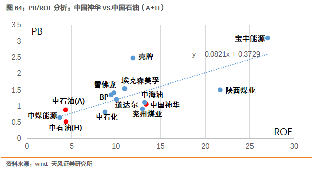 中国石油:结合目前ROE 看A 股不算低估,H 股显著低估。将与中石油同行业的中石化、中海油、埃克森美孚、BP、雪佛龙、壳牌、道达尔以及与中国神华同行业的中煤能源、陕西煤业、兖州煤业、宝丰能源这些公司PB/ROE 做回归分析。就中国石油目前的ROE 水平而言,其PB0.88 仍显高估,而中国石油股份(H)PB 低至0.51 倍,显著低估。关注公司未来上游增储降本、天然气提价的策略能否有效提高其ROE 水平。