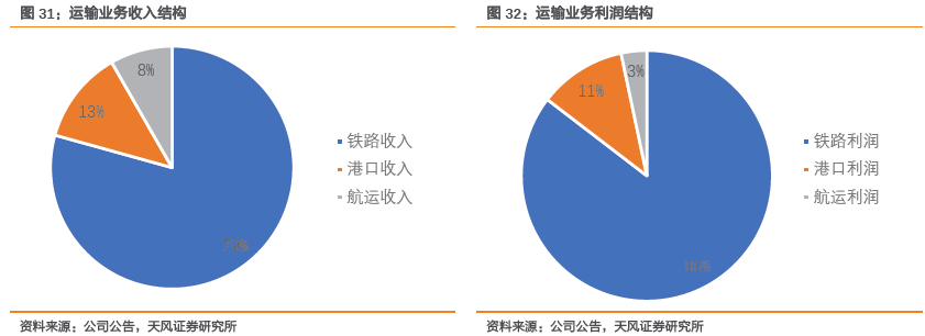 从运输收入及利润来看,铁路运输占据了运输业务收入的79%和运输业务利润的86%。