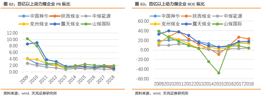 中国神华:PB 走势基本与煤炭行业PB 走势相符。截止2018 年末,神华PB 为1.09,在动力煤市值超百亿的七家上市公司中排第三。排名第一为山煤国际,PB 为1.88,山煤国际其新能源投资项目受市场关注度较高,因此估值明显高于同业;排名第二的为陕西煤业,PB 为1.47,陕西煤业资源禀赋好,吨煤成本仅次于中国神华,此外公司受大额回购及浩吉铁路开通影响,享受相对较高的估值。