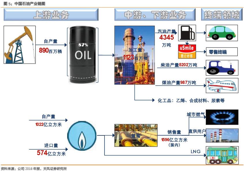 产业链结构来看,中国石油是一体化公司。原油产量、原油加工量、成品油销售量比例大致是4:5:6 的关系。