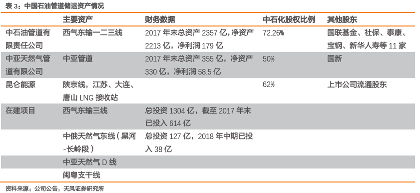 中石油体系内涉及管道储运资产的公司主体包括,中石油管道有限、中亚天然气管道、昆仑能源,涉及主干、支干管网、LNG 接收站。我们估算总资产在3400 亿左右,净资产2900亿,归属中石油股份约2000 亿。