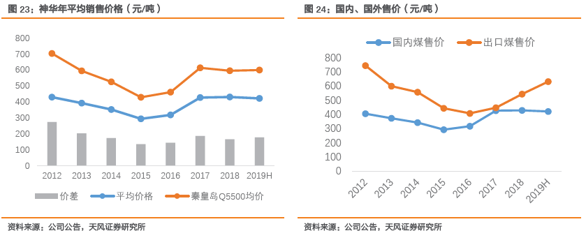 神华年长协和月长协比例基本稳定。结合三种定价模式,神华年销售均价与市场价呈强正相关关系,参考秦皇岛动力煤Q5500,神华动力煤价格总体低于市场价150-200 元/吨左右。