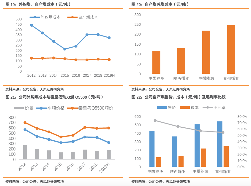 成本方面:自产煤方面,公司自产煤成本基本保持稳定,与市场价格相关性不大,预计自产煤成本稳定在110 元/吨。外购煤方面,公司外购煤成本与市场价呈正相关关系,从12-18年的数据估算,公司外购煤成本约为秦皇岛动力煤Q5500 市场价格的60%左右,此处假设公司外购煤成本为秦皇岛动力煤Q5500 的60%。