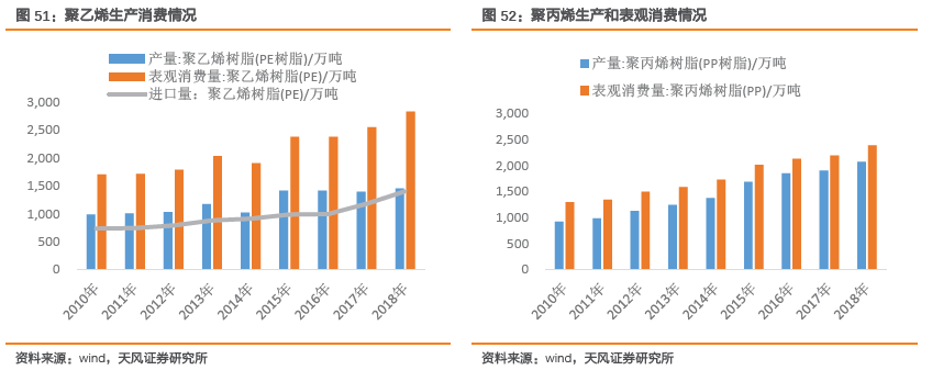 从需求端看,我国聚乙烯一直存在自产缺口,聚乙烯树脂表观消费量一直呈上升趋势,到了2018 年,PE 的表观消费量与产量之差甚至达到了1380 万吨,2018 年进口量达到1402.45万吨。国内生产市场还有巨大的潜力。