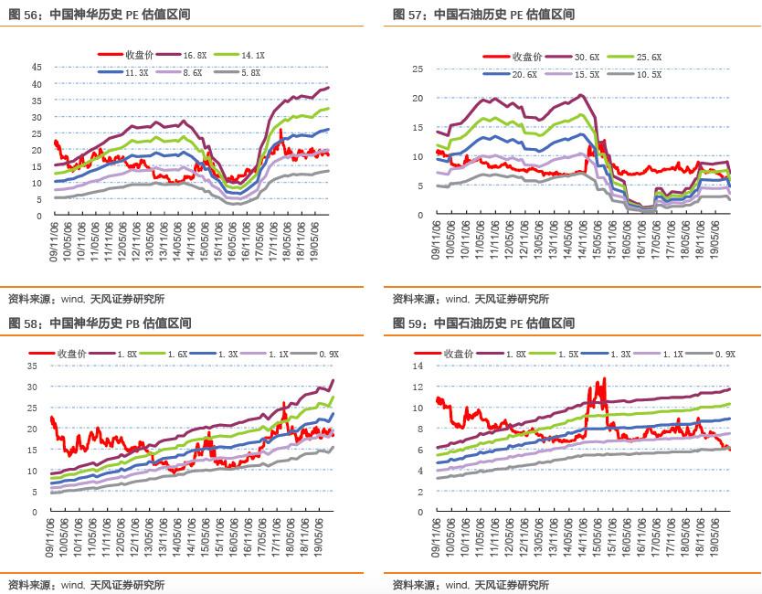 中国神华:PE 和PB 均处于历史均值20%分位左右,PB 处在1 附近,接近破净。PE 在16年末达到最大,彼时煤价受供给侧改革影响处于高位,说明公司盈利受煤价影响较大。过去6 年公司PB 在0.9x-1.7x 之间,这主要受大盘估值影响。