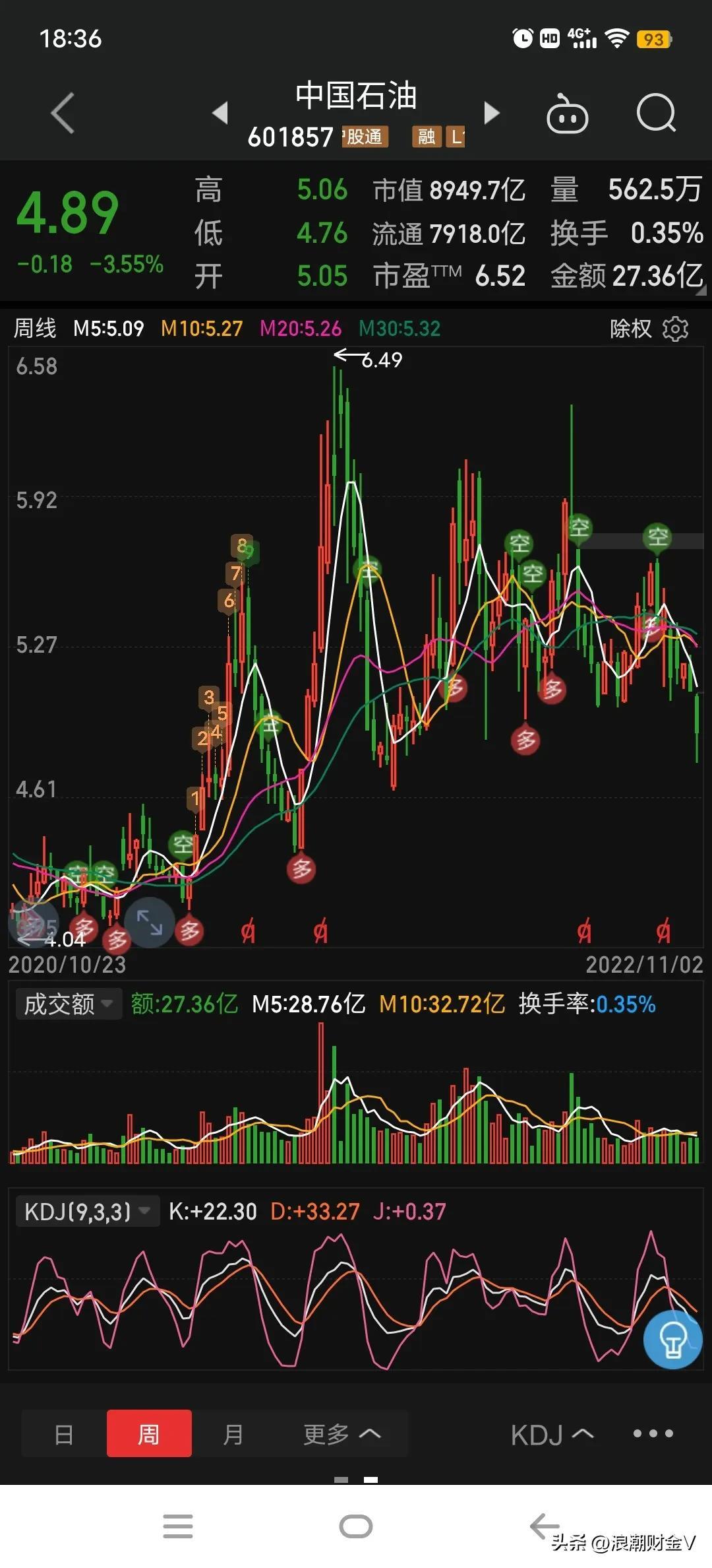 而且,已经跌破了全部的趋势性的均线,呈现一个标准的空头排列。也就是说,单纯从技术上看,中国石油阶段性的中短期趋势性的价格仍然是看跌。