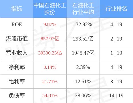 中国石油化工股份港股市值857.97亿港元,在石油化工行业中排名第2。主要指标见下表: