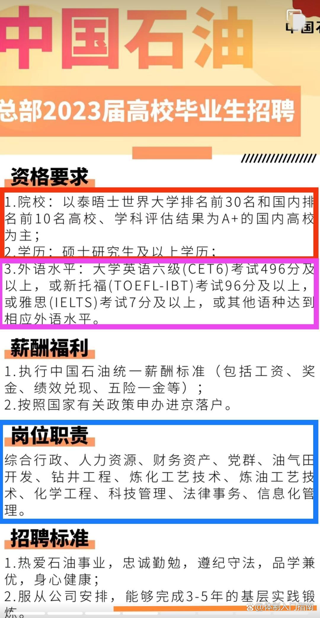 下面这一张图就是中国石油总部2023届高校毕业生招聘的整体要求,内容和信息非常的全面,希望能够帮助到大家,感兴趣的朋友可以多多关注、收藏并转发!