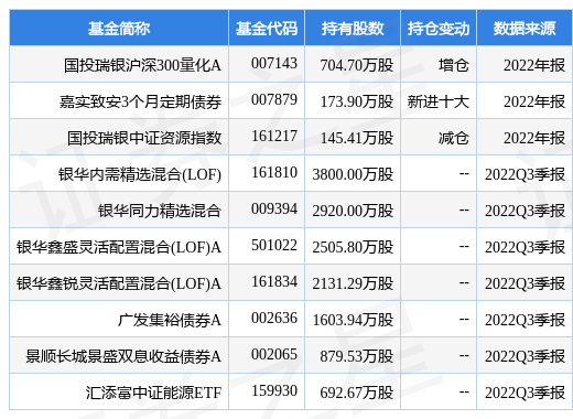 其中持有数量最多的基金为国投瑞银沪深300量化A,目前规模为9.8亿元,最新净值1.3199(1月18日),较上一交易日下跌0.01%,近一年下跌9.82%。该基金现任基金经理为殷瑞飞。