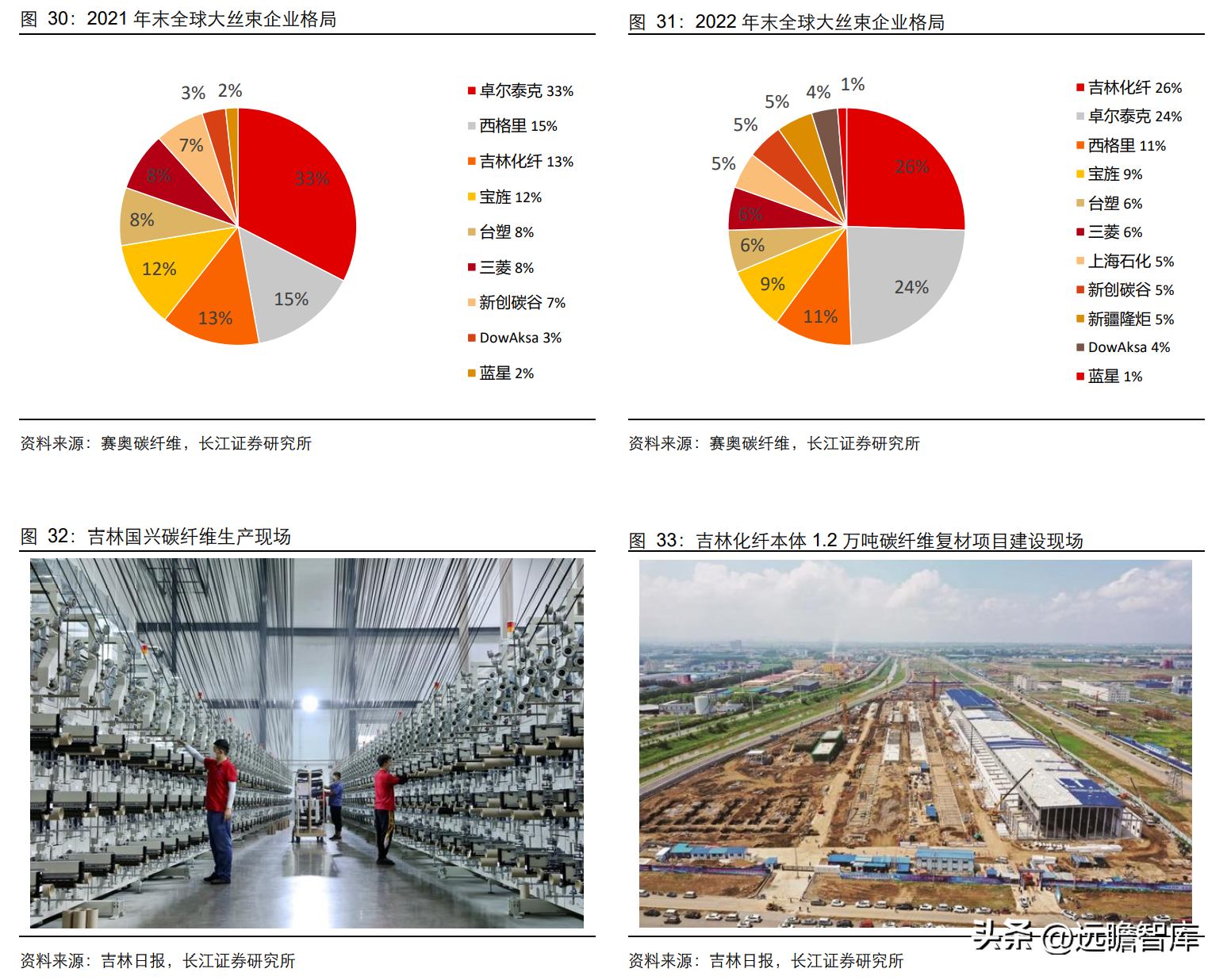 经过 2022 年国兴碳纤维与上市公司本体的大幅扩产,2022 年末吉林化纤相关碳化产能已增至约 3.1 万吨/年(不含吉林宝旌),产能已位列大丝束碳化企业全球第一,已高于卓尔泰克。未来随着公司持续扩产,领先优势将进一步拉大。