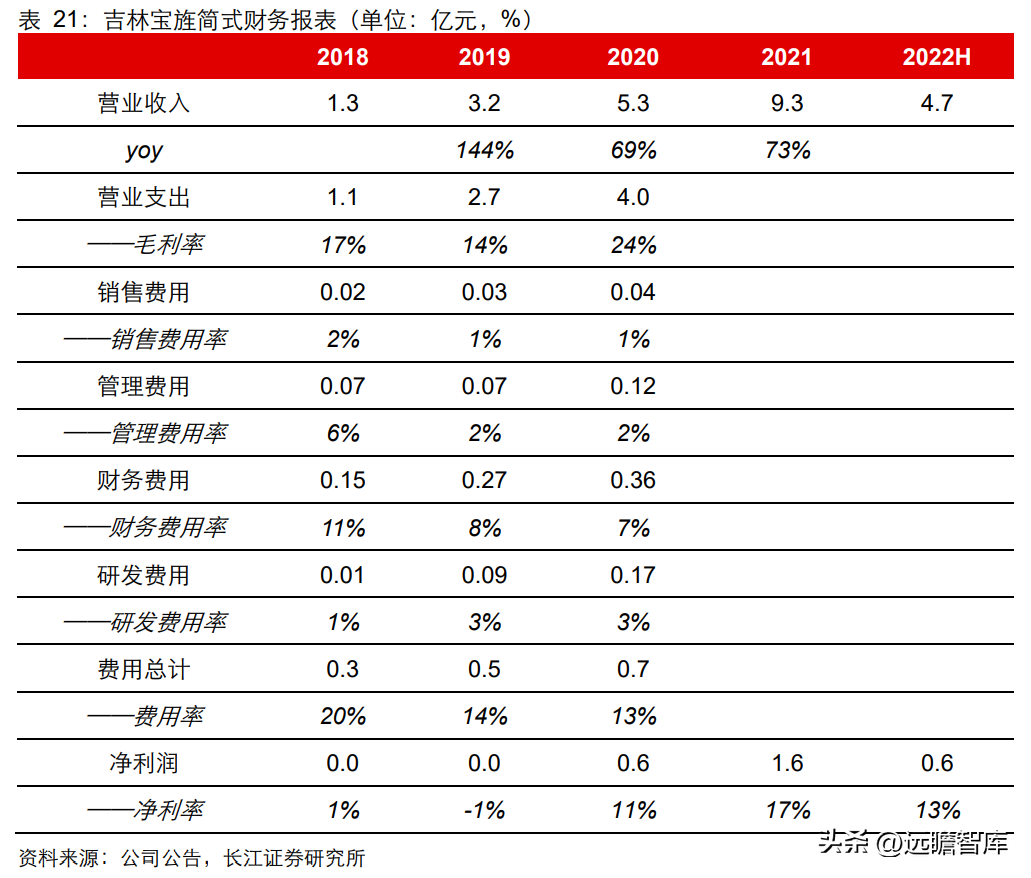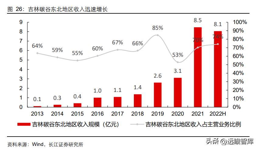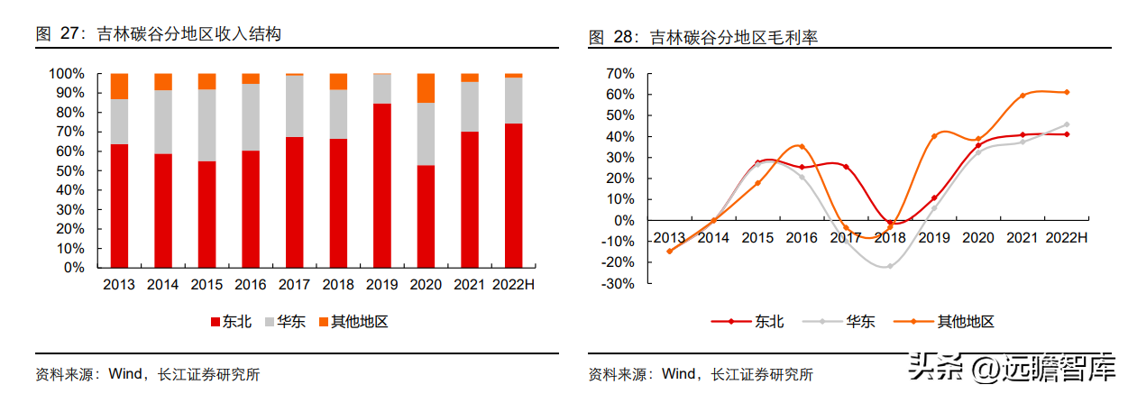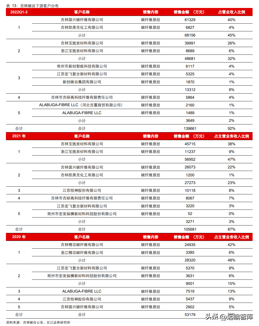 吉林碳谷收入来源主要集中在东北,2022 年上半年占比 70%以上,主要客户集中于国兴碳纤维、吉林宝旌等。吉林化纤与吉林碳谷同属吉林市国资委控制,因而在原丝供给偏紧的背景下,也会对吉林化纤优先保供。同时,两者技术团队同出一辙,长期进行合作研发交流,吉林化纤对吉林碳谷原丝的理解更为深刻,因而碳化环节也更具效率,更具成本优势。
