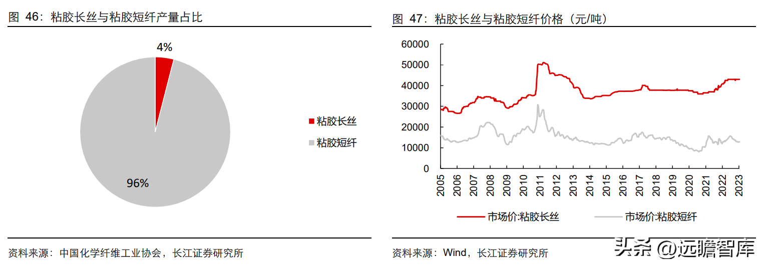 粘胶纤维主要分为长丝与短纤,长丝更近丝绸,产量较少价格更高。