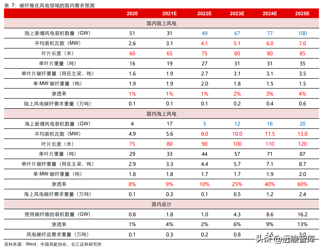 考虑国内海风装机大幅增长及大型化带来的碳纤维应用渗透率提升,同时考虑海外增长,预计至2025年中国风电碳纤维需求有望达到6.8万吨(包括出口),年均复合增速32%,对应市场空间约 75 亿。