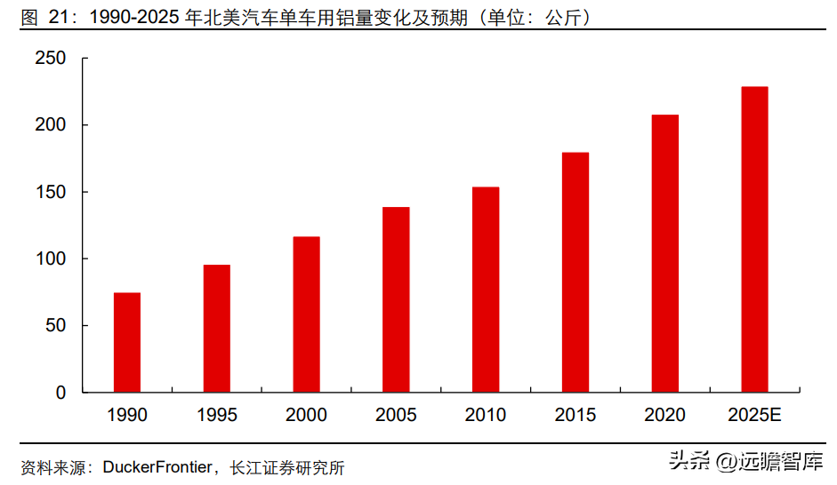 汽车轻量化一直是进行时,参考铝合金在北美汽车用量的演变,单车用铝量从 1990 年的 75 公斤提升至 2020 年的208 公斤。碳纤与玻纤等复合材料在汽车中的用量也逐渐增加,玻纤更适合制成汽车非结构件、装饰件,而碳纤维适合运用在车身结构件。当前碳纤维在结构件中应用较低,未来远景空间广阔。