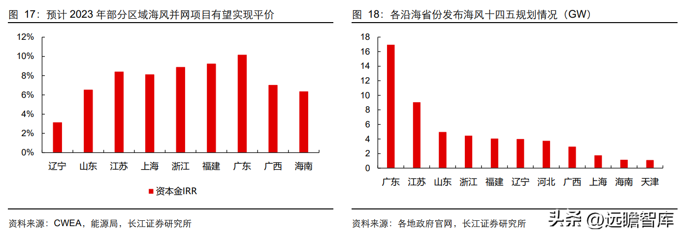 随着海风项目建设成本的不断下移,海风行业平价正加速到来。假设项目上网电价是当地燃煤标杆电价(若存在地方补贴则考虑 2023 年的补贴)以及贷款比例 70%的背景下,部分地区 2023 年建设并网的项目能够达到平价阶段。