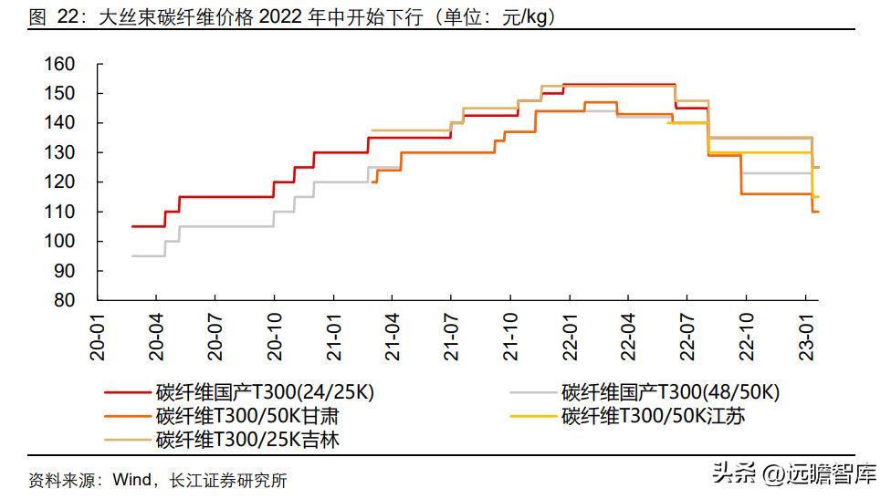 2022 年国内风电领域碳纤维需求较弱,且叠加 5-8 月吉林国兴的集中投产,大丝束碳纤维价格年中时已出现下行。