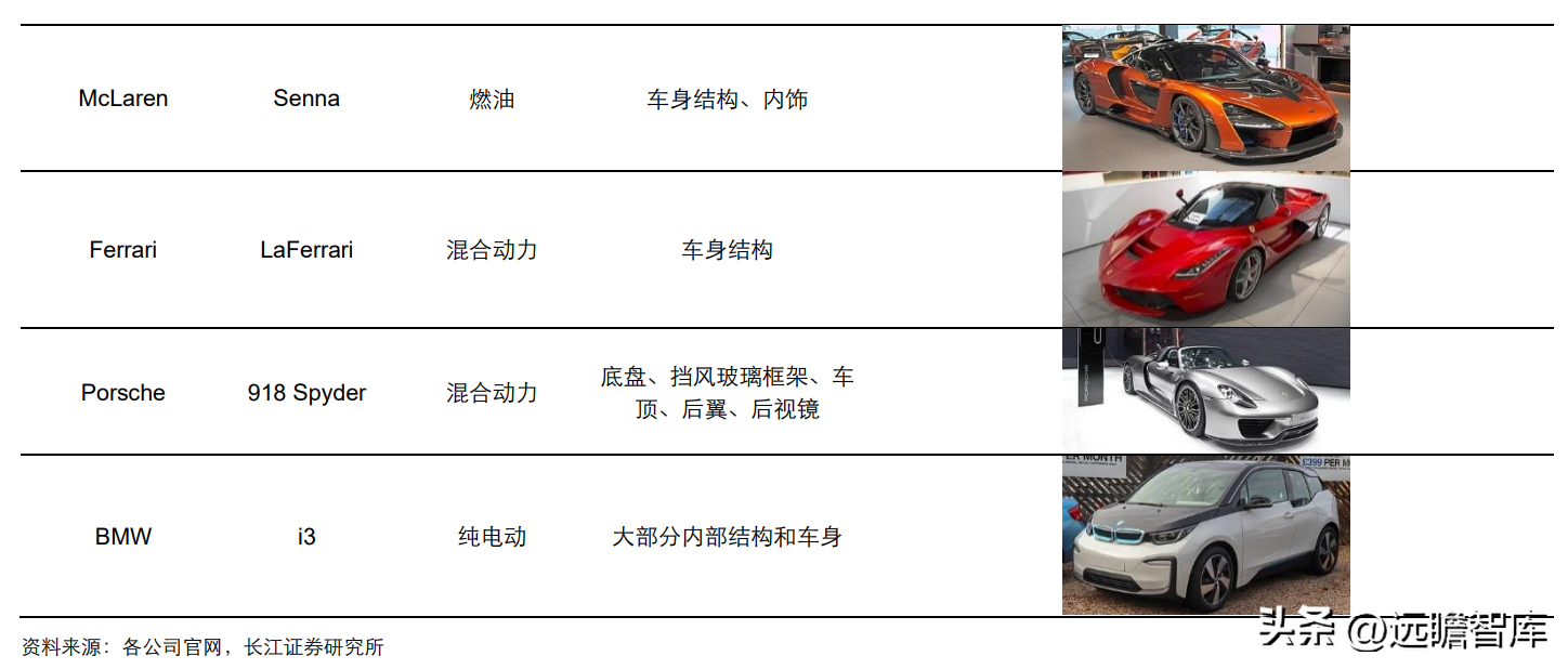 碳纤维价格昂贵,最初在汽车领域主要应用于超跑、赛车等豪华车型,该类车型拥有高性能要求以及低价格敏感度的特点。