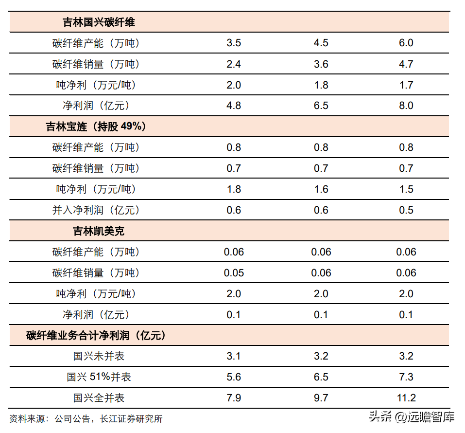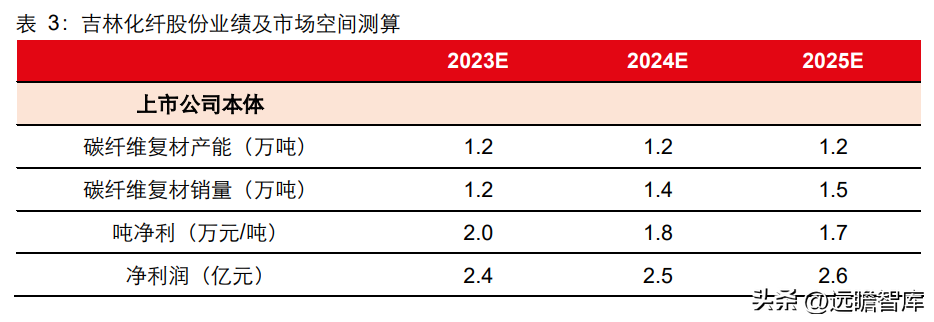 我们对吉林化纤碳纤维业绩做出测算,预计 2023 年上市公司本体碳纤维净利润约 2.4 亿元,若考虑国兴碳纤维 51%并表以及吉林宝旌等,预计 2023 年碳纤维净利润将达到 5.6 亿元。