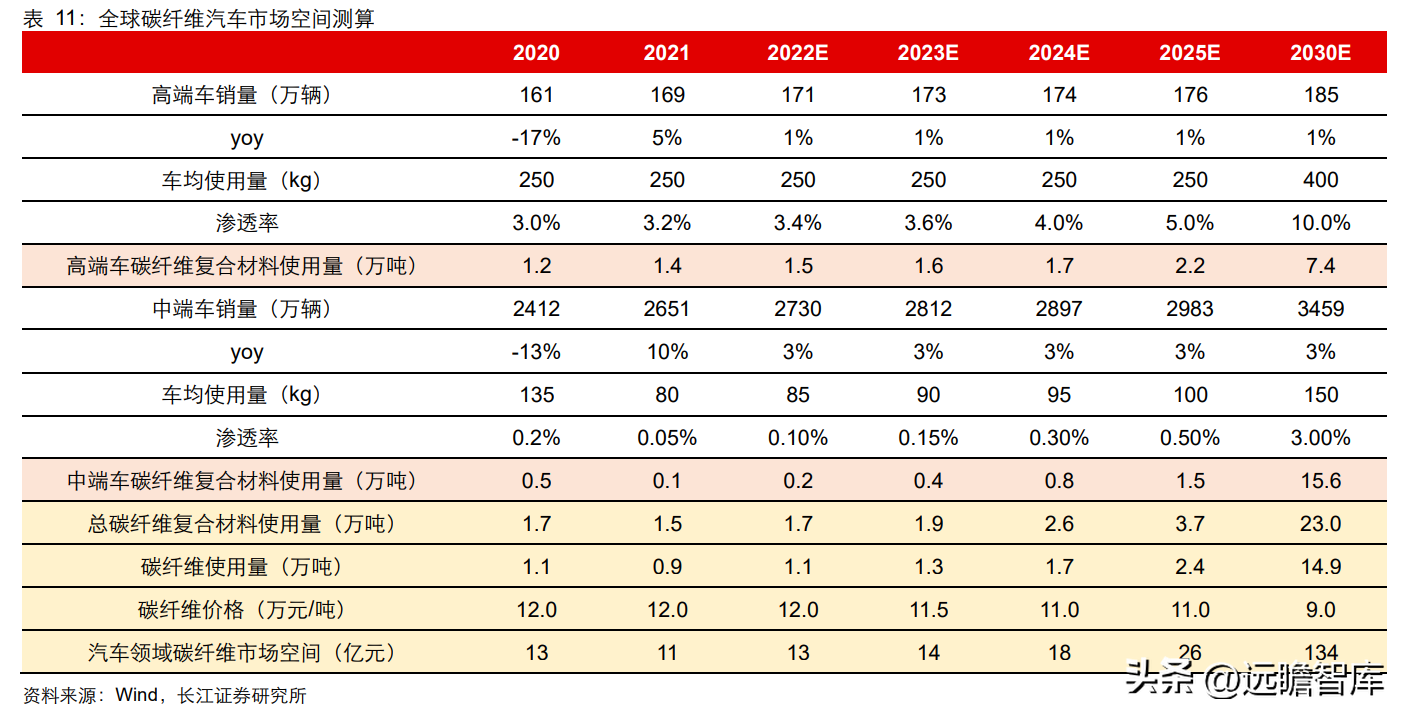 根据测算,2025 年全球汽车碳纤维用量为 2.4 万吨,对应市场空间 26 亿元;2030 年用量为 14.9 万吨,对应 134 亿元。目前碳纤维价格尚掣肘其在汽车中的应用,随着碳纤维成本下降,碳纤维在车身结构等应用有望加速渗透。