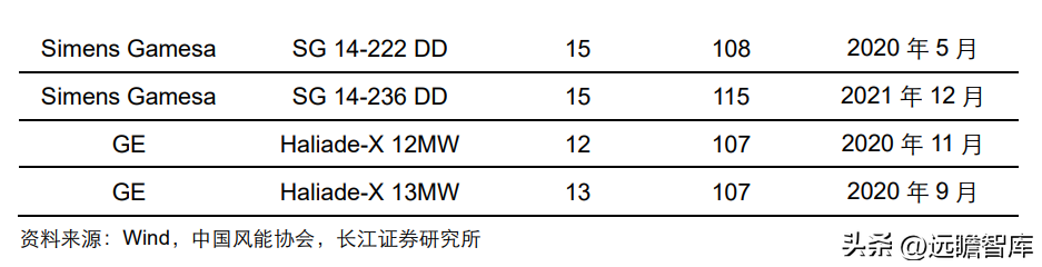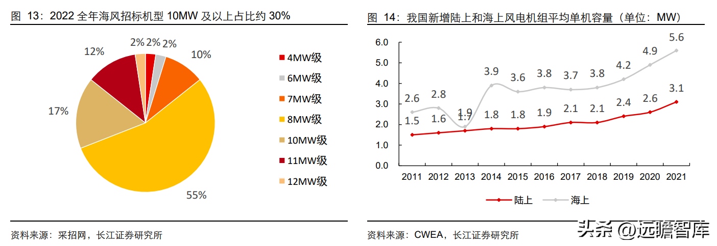 目前国内主要海上风机主机厂已推出使用 10MW、100 米以上叶片的大功率机型,考虑到机型推出至批量吊装约 2-3 年的周期,预计国内 2024-2025 年 10MW、100 米以上叶片的机 型或得以批量装机,届时将更大幅度拉动国内海上风电碳纤维的应用需求。2022 全年海风招标机型 10MW 及以上的占比已达 30%,可作为印证。