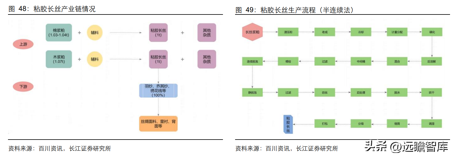 粘胶纤维上游主要为棉花、木片和竹片生产的溶解浆,下游为纺服行业。粘胶纤维产品具有吸水性好,柔软透气,可降解可再生,抗皱褶能力强,光泽度好的优势,表现出较好的悬垂性,上身舒适,不会出现静电。