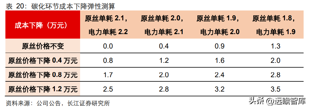 我们考虑单耗下降,做弹性测算,若原丝单耗从 2.1 降至 1.9,电力单耗从 2.2 降至 2.0,则可以带来 0.9 万元/吨的成本下降,若考虑原丝价格下降则成本下行更加显著。