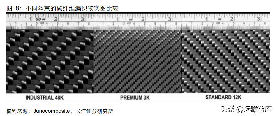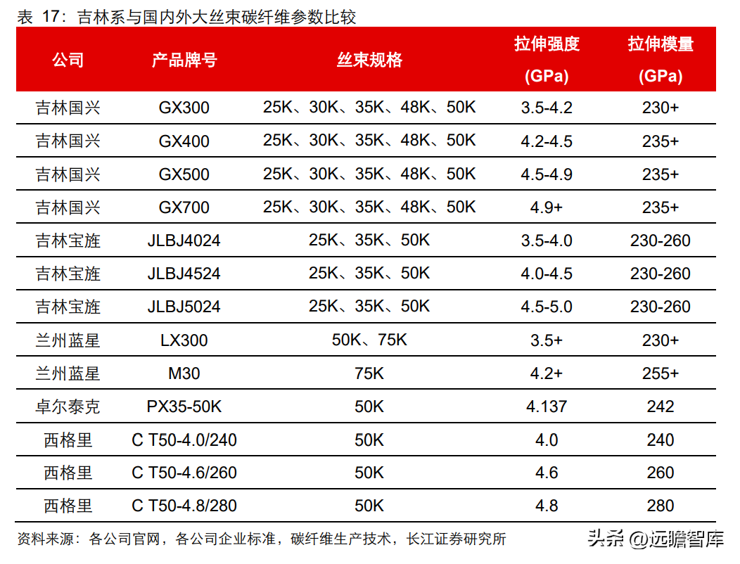 吉林系碳纤维资产以大丝束为主,我们通常把大于 24K 的碳纤维称为大丝束碳纤维(1K 代表一束碳纤维中有 1000 根丝),在相同的生产条件下因单束碳纤维的丝数更多,故生产环节较难控制,通常性能弱于小丝束,但可以提高碳纤维单线产能,降低生产成本,从而实现更大规模的工业应用。