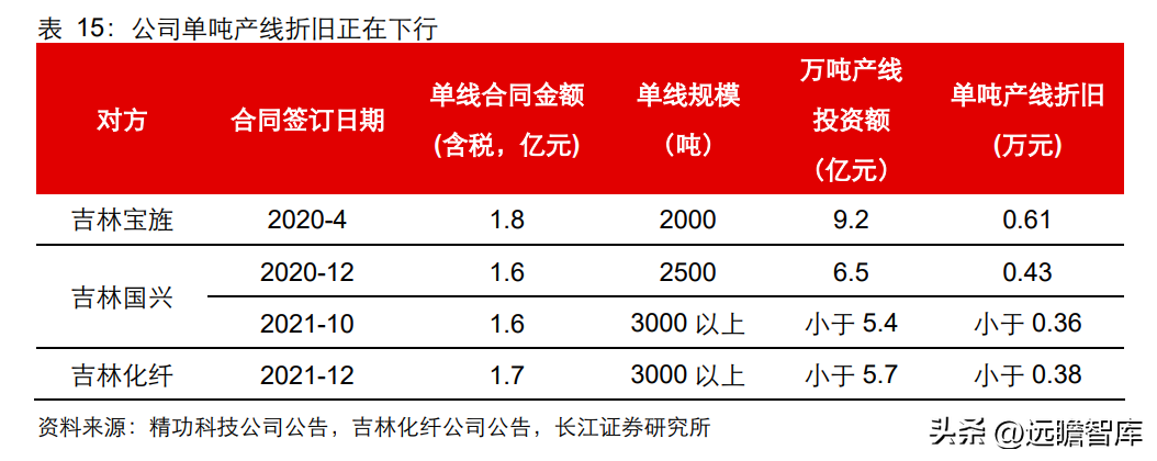 吉林系凭借与精功长期深度合作,对其设备理解更加深刻,更能发挥出其产能。同时随着精功设备升级,随着吉林系研发生产更大丝束的碳丝(35K、50K 等),两年间产线单线规模从 2000 吨迅速增加至 3000 吨以上,这也带来单吨产线折旧的极大摊薄,折旧从约 6000 元/吨下降至 3800 元/吨以下。