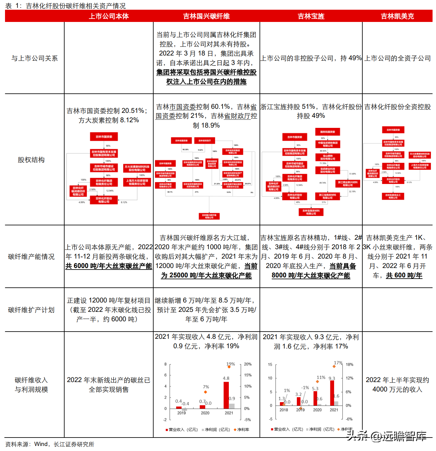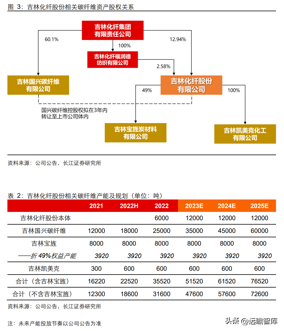 吉林化纤股份相关的碳纤维资产主要由上市公司本体、吉林国兴、吉林宝旌、吉林凯美克四部分组成,包括本体 0.6 万吨的大丝束产能、吉林国兴 2.5 万吨的大丝束产能、吉林宝旌约 0.4 万吨的大丝束权益产能,吉林凯美克 600 吨的小丝束产能。