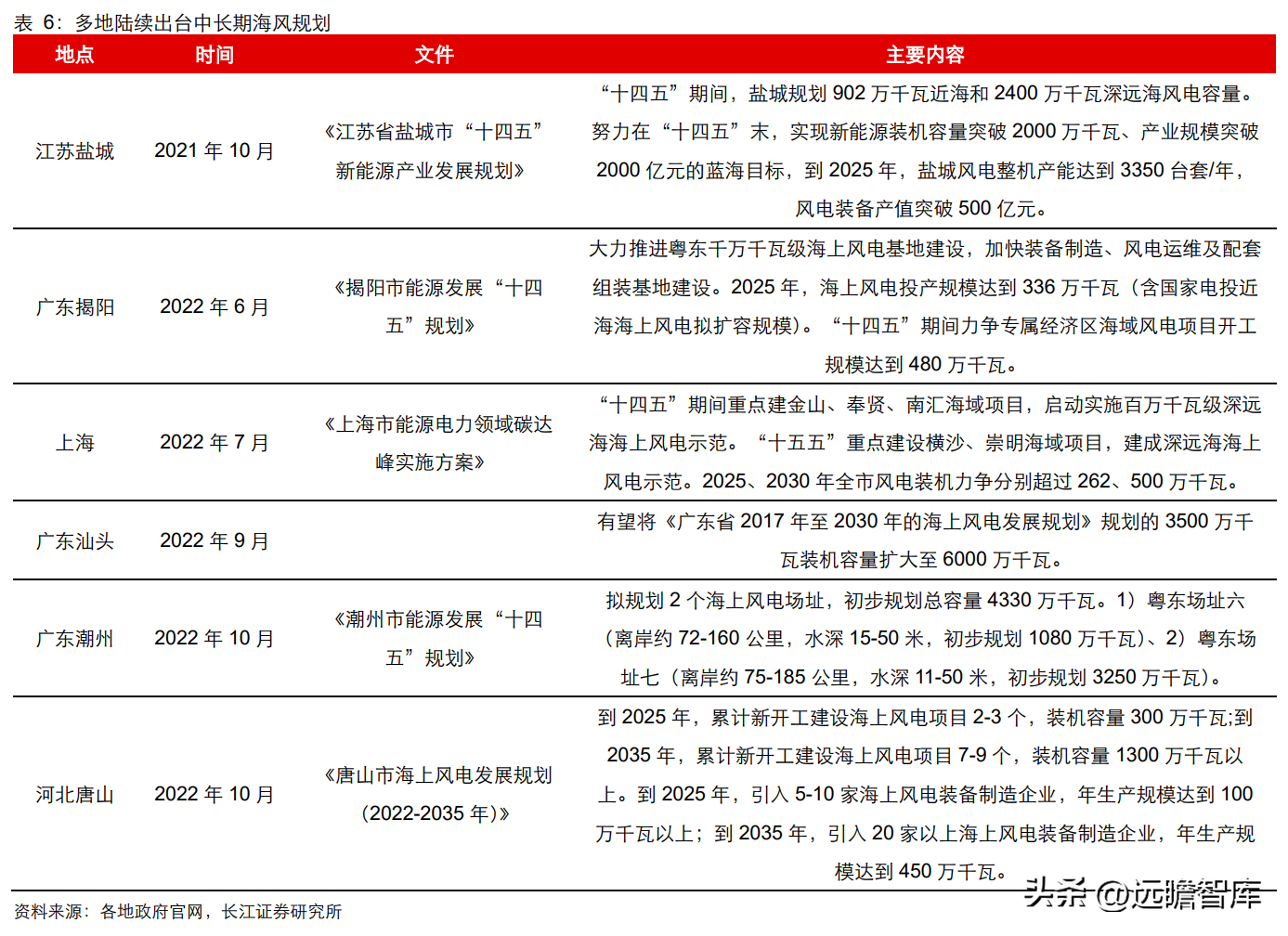 此外,对于十四五,目前各沿海省份均出台较为明确的海风规划,梳理来看,十四五海风规划规模合计约 60GW,其中广东、江苏、山东、浙江、福建规划规模靠前。再往长期看,各地市也陆续出台中长期海风规划,为十四五后海风储备规模进一步奠定基础。