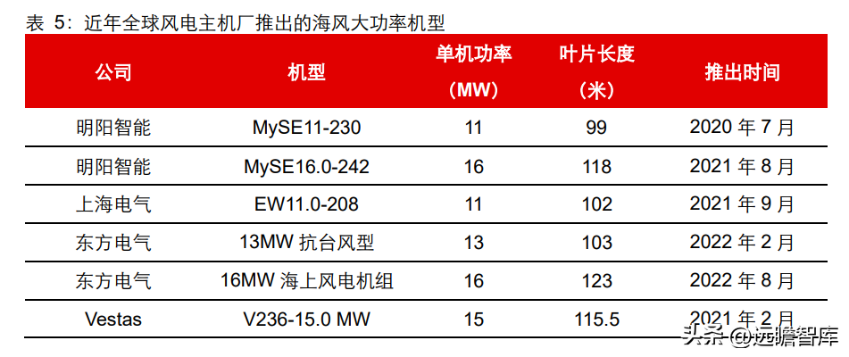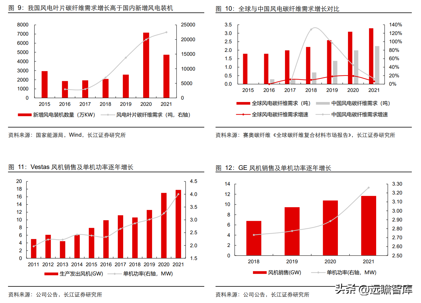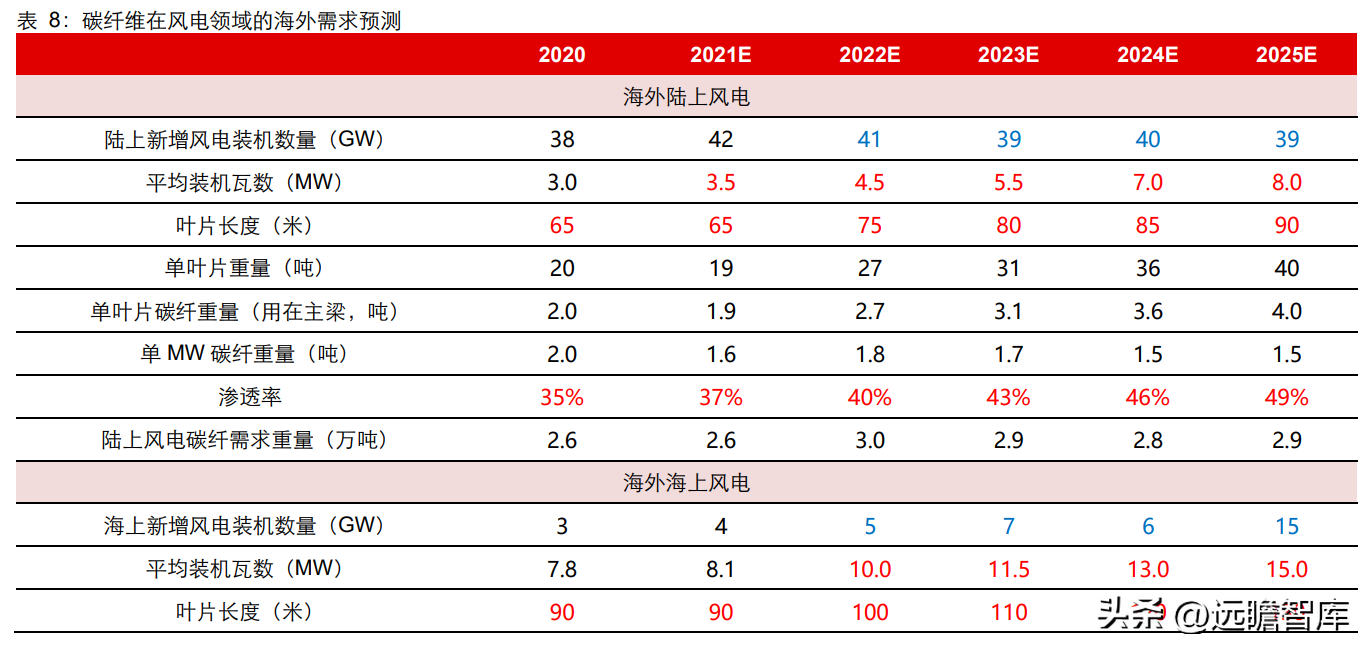 随着海上风电大型化进程加快,100 米以上叶片用玻纤或难以满足其性能要求,尤其 110 米以上叶片使用碳纤维主梁或将成为强制。