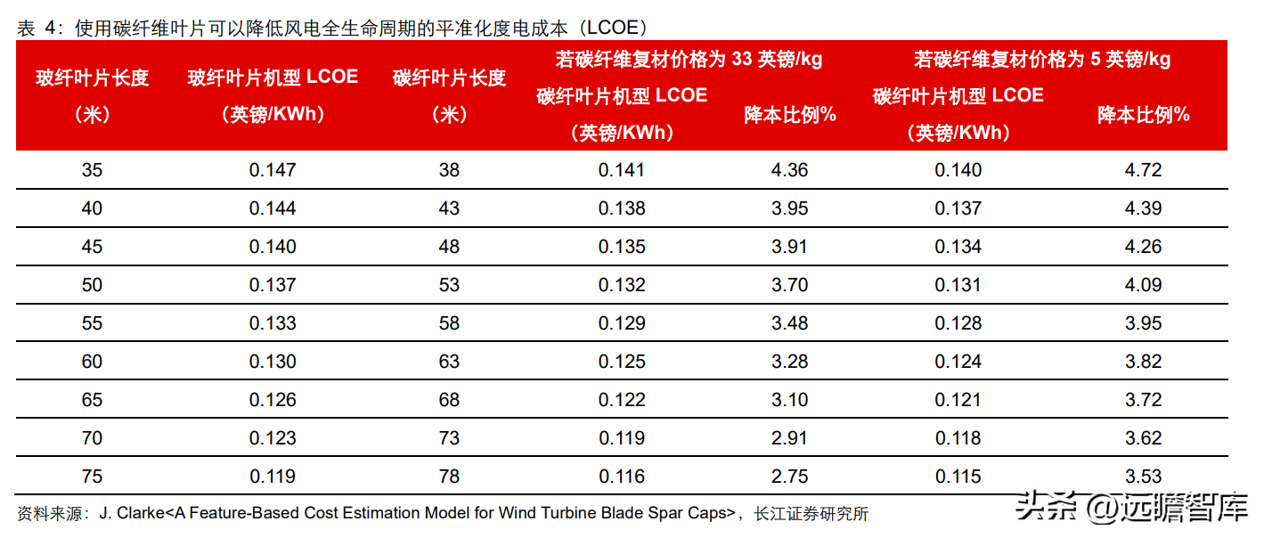 从风电全生命周期考虑,使用碳纤维叶片的机型有望实现更高效率,降低总发电成本。虽然碳纤维价格昂贵,使用碳纤维会增加叶片制造成本,但根据 J. Clarke 等在 2020 年发表的论文,从平准化度电成本(LCOE,生命周期内的总成本现值/总发电量现值)角度,考虑 25 年,使用碳纤维主梁的叶片可以比使用玻纤平准化度电成本节约 2.75%-4.36%,若假设碳纤维复材价格降至与玻纤复材类似,节约比例可提升至 3.53%-4.72%。同时,机型越小,使用碳纤维的降本效果越好。