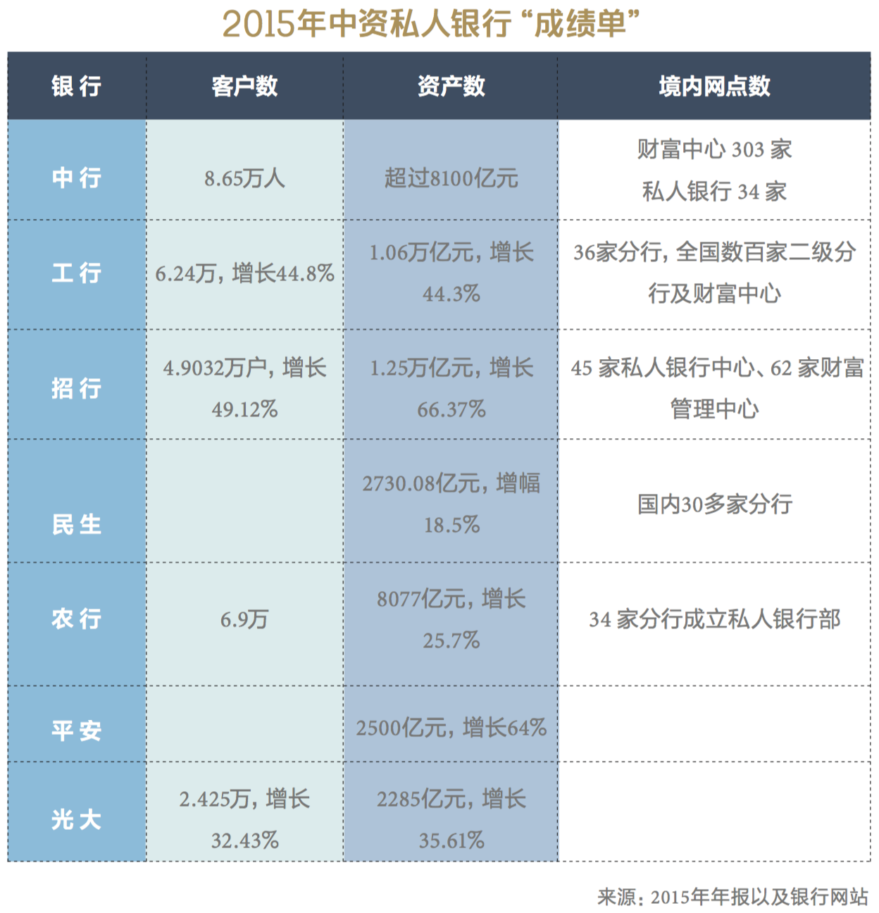 目前,不仅全国性银行都设立了私行中心,包括北京银行、上海银行等在内的城商行也加入客户争夺战。根据银行刚刚发布的2015年年报数据,客户数量最多的为中行——8.65万人,资产管理规模最大的为招行——1.25万亿元。