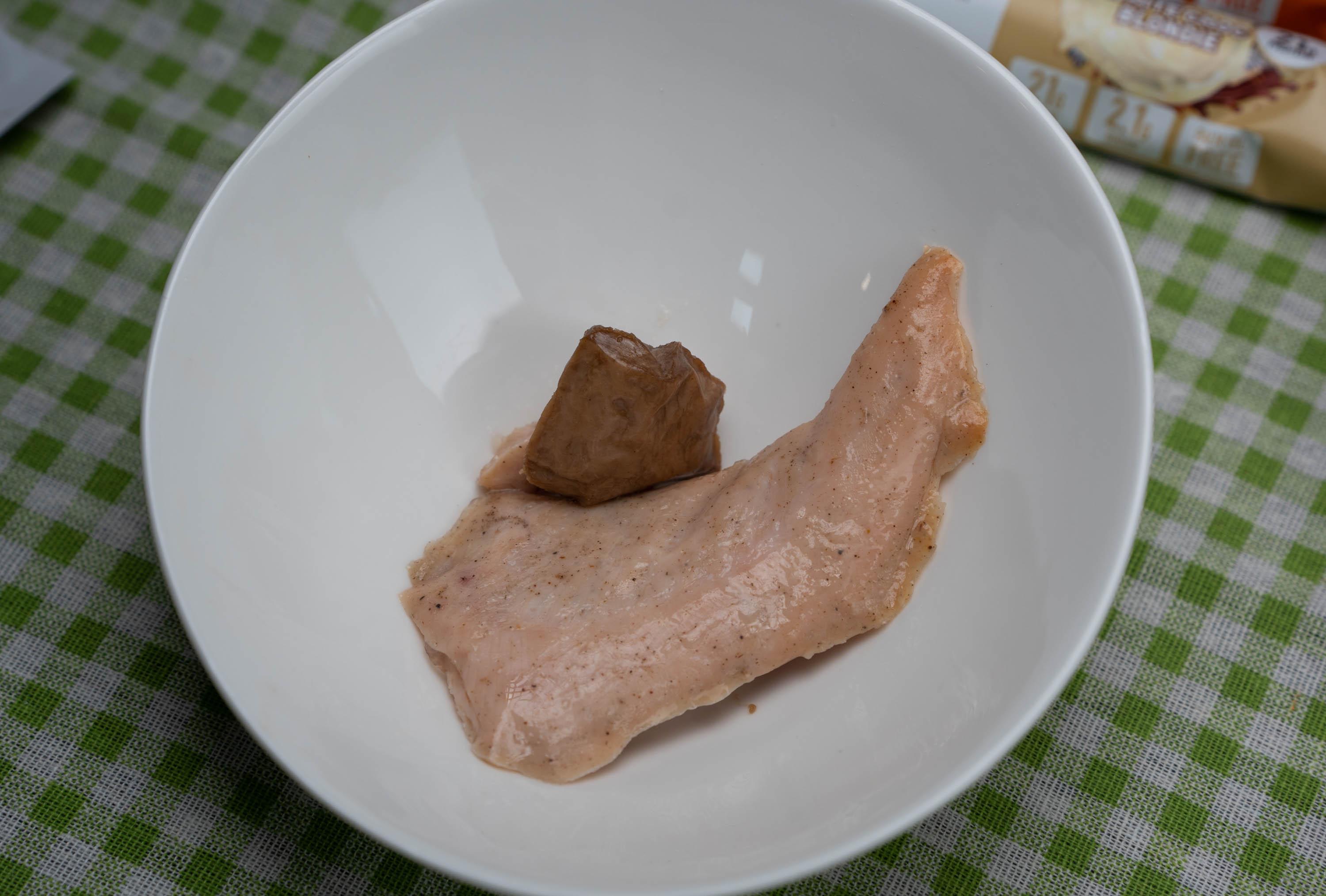 跟上面说的鸡小胸放在一起的样子,素肉吃起来比鸡小胸更深色一些。