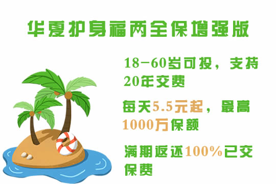 华夏护身福增强版保障期间至75岁,前期少量投入,百万身价保障人生各个重要阶段。