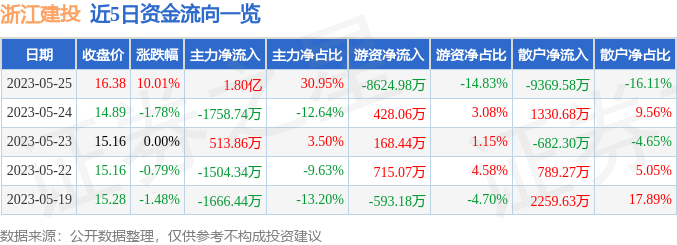 浙江建投涨停收盘,收盘价16.38元。该股于10点20分涨停,1次打开涨停,截止收盘封单资金为5134.68万元,占其流通市值0.29%。