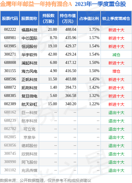 金鹰年年邮益一年持有混合A的前十大重仓股如下: