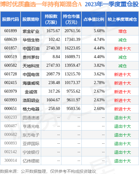 博时优质鑫选一年持有期混合A的前十大重仓股如下: